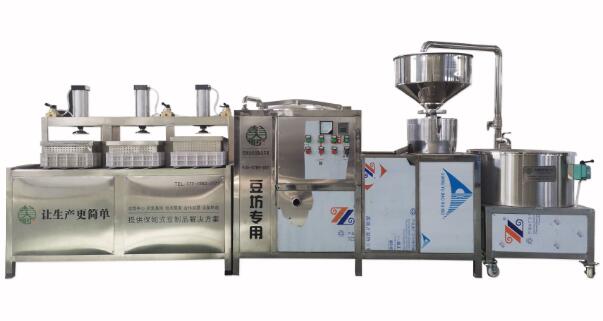 豆腐機是把大豆做成豆腐,豆?jié){等一些豆制食品的機械。豆腐機由分離式磨漿機、盛漿桶、盛渣桶、蒸汽包等組成,由蒸汽發(fā)生器產(chǎn)生蒸汽來達到煮漿的目的,意外熄火時自動切斷氣源,由溫控儀控制煮漿桶溫度,達到自動點火加熱?赏瑫r生產(chǎn)豆?jié){、豆?jié){豆花、各式豆腐等多種豆制品,還可以與其他設(shè)備和工藝配套生產(chǎn)更多的豆制品。