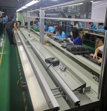 采用鋼制機(jī)架和專用鋁合金軌道為主件,流水線可分有手推式和自動(dòng)式,該類流水線是廣泛應(yīng)用于電子行業(yè)。