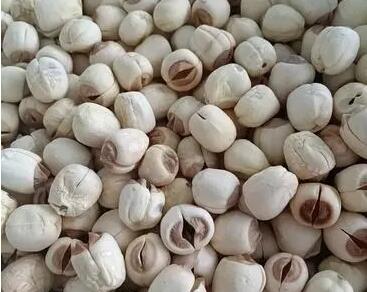 蓮子為小堅果。呈橢圓形、卵形或卵圓形,其大小因品種而異,一般長1.6-1.8厘米,寬1.1-1.2厘米,千粒重1100-1400克,幼果期果皮綠色,革質(zhì),后由綠轉(zhuǎn)褐色,成熟時呈棕褐色、灰褐色和黑褐色。有細縱紋和較寬的脈紋。一端中心呈乳頭狀突起,深棕色,多有裂口,其周邊略下陷。質(zhì)硬。種皮薄,不易剝離。子葉2,黃白色,肥厚,中有空隙,具綠色蓮子心。無臭,味甘、微澀。