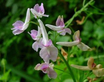 延胡索 別名:玄胡索,元胡Corydalis turtschaninovii Bess. f. yahusuo Y. H. Chou et C. C. Hsu ( C.bulbosa auct. non DC.,C. yanhusuo W. T. Wang)── 多年生草本,高10一20cm。塊莖扁球狀,直徑0.5-2.5cm,黃色。莖基部具1鱗片,鱗片和下部葉腋內(nèi)常生小塊莖;莖生葉具長柄,2回出全裂,末回裂片披針形或卵狀披針形?偁罨ㄐ蝽斏,疏生3一l0花,苞片卵形或狹卵形,全緣或下部具齒;萼片小,早落;花冠紅紫色,上花瓣長約2cm,邊緣具齒或波狀小齒,頂端微凹,具短尖,距圓筒形,稍長于瓣片,蜜腺體貫穿距長的l/2,內(nèi)花瓣暗紫色,雄蕊束披針形;子房線形,花柱細,柱頭近圓形,具8乳突。蒴果線形,種子l列;ㄆ4月。果期4-5月。