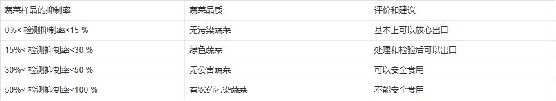 以農(nóng)藥殘留檢測(cè)儀測(cè)時(shí)其抑制率一般可自動(dòng)計(jì)算。若樣品抑制率≥50%,表示樣品農(nóng)殘超標(biāo),為陽(yáng)性結(jié)果。陽(yáng)性結(jié)果的樣品需做2次以上重復(fù)檢測(cè),多次檢測(cè)仍呈陽(yáng)性需用氣相色譜等儀器做進(jìn)一步確認(rèn)。