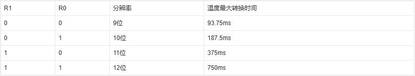 低五位一直都是"1",TM是測試模式位,用于設置DS18B20在工作模式還是在測試模式。在DS18B20出廠時該位被設置為0,用 戶不要去改動。R1和R0用來設置分辨率,如下表所示:(DS18B20出廠時被設置為12位)