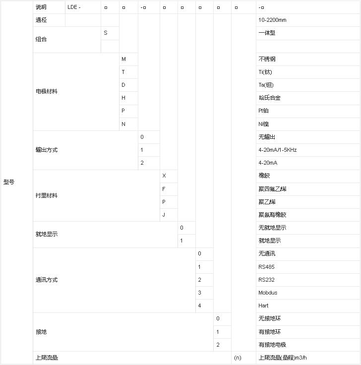 例:選用一臺就地顯示型電磁流量計測量污水,用戶管道為DN50,要求橡膠材料襯里,不銹鋼電極,4~20mA輸出,無通訊,上限流量為30m3/h。型號應(yīng)為:LDE-50S-M1X100-30