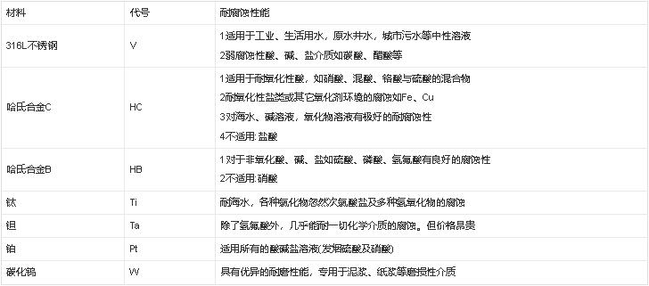 電極材料由含鉬不銹鋼0crl8Nil2Mo、鈦Ti、哈氏合金B(yǎng)、哈氏合金c、鉭和特殊材料六種。