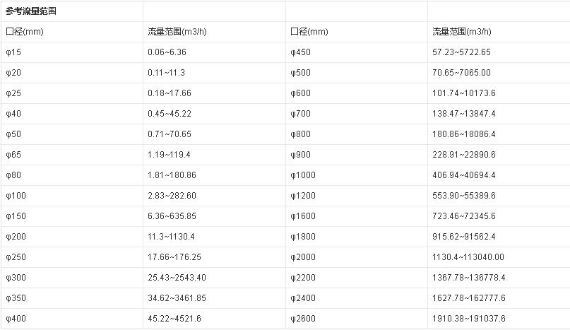 在量程Q已確定的條件下,即可根據上述流速V的范圍決定流量計口徑D的大小,其值由下式計算: