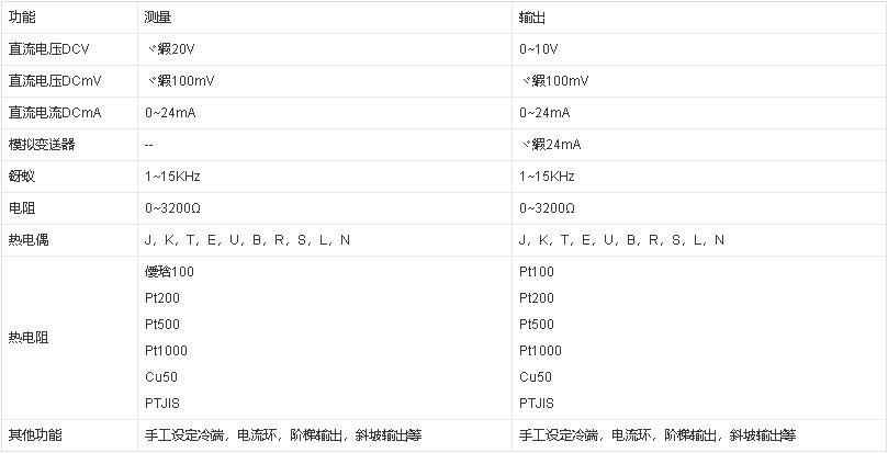 它不僅可測量電流、電壓、毫伏以及頻率信號,還可以配接八種熱電偶(J、K、T、E、B、R、S、L、N) 和 六種熱電阻(PT100、PT200、PT500、PT1000、Cu50、PTJIS)測量溫度;可輸出電流信號(有源和無源)、電壓信號、毫伏、電阻和頻率信號,以及模擬熱電阻和熱電偶輸出,而且還可提供DC24V配電。