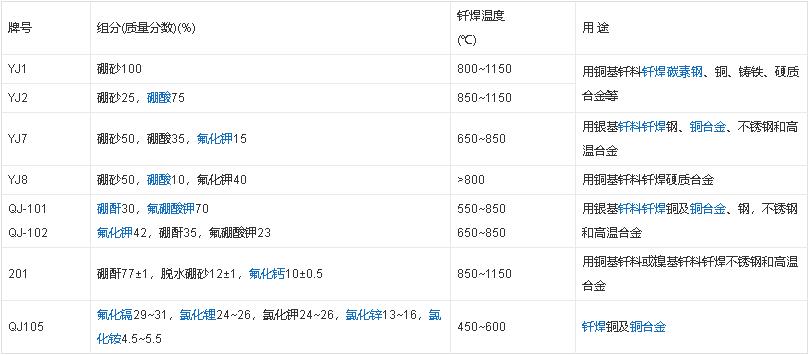 黑色金屬常用的硬釬劑是硼砂、硼酸及其混合物。這些釬劑的粘度大、活性溫度相當(dāng)高,必須在800℃以上使用,并且釬劑殘渣難于清除。在硼化物中加入堿金屬和堿土金屬的氟化物及氯化物,可以改善硼砂、硼酸釬劑的潤濕能力,提高去除氧化物的能力,以及降低釬劑的熔化溫度及活性溫度。