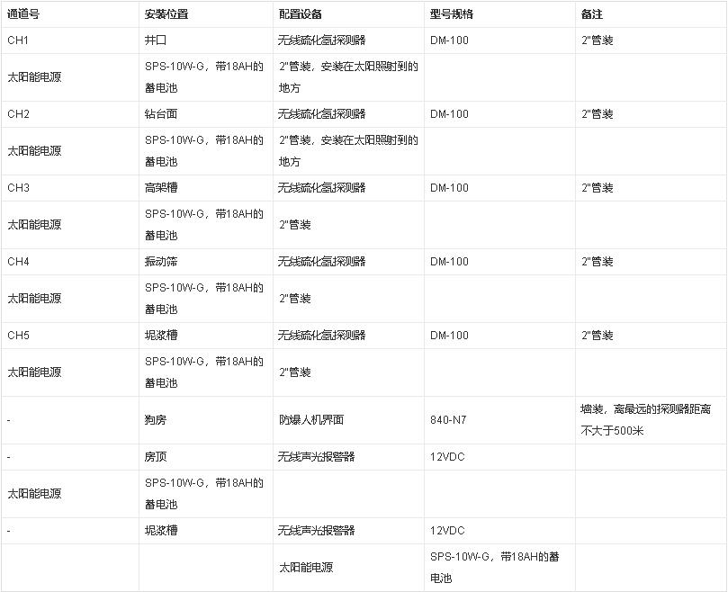 對于無可燃氣體的3000米鉆井,可只配硫化氫探測器,數(shù)量五臺即可,另外還要配兩個聲光報警器、一個人機界面。探測器與報警器均帶太陽能電源,通過無線與人機界面來通訊。系統(tǒng)組成如下表: