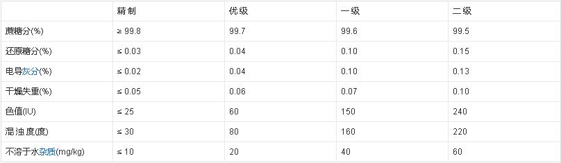 白砂糖按技術(shù)要求的規(guī)定分為精制、優(yōu)級(jí)、一級(jí)和二級(jí)共四個(gè)級(jí)別。