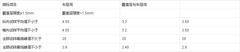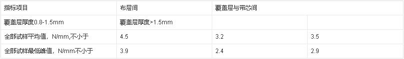 層間粘合強(qiáng)度縱向試樣平均值布層間不小于4.5N/mm,覆蓋膠與布層間不小于3.2 N/mm