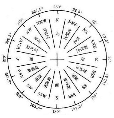 風向常用8個方位(東、東南、南、西南、西、西北、北、東北)表示,在氣象觀測記錄上則使用16個方位(除8個方位之外還有:北東北、東東北、東東南、南東南、南西南、西西南、西西北、北西北)表示,如圖1所示。