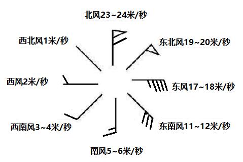 風向桿是風矢的組成部分之一,桿長約0.6~0.8厘米。桿的一端止于站圈(或站點上空某高度處),另一端指向風的來向,并在桿的末端填寫風羽。