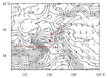 圖3中可見,紅色線為風向輻合區(qū),紅線北側多為東北風、北風和西北風,紅線南側為東南風及南風。