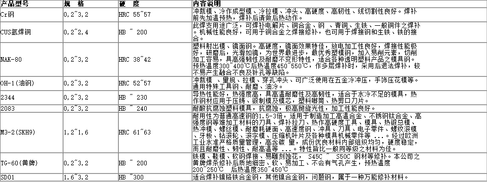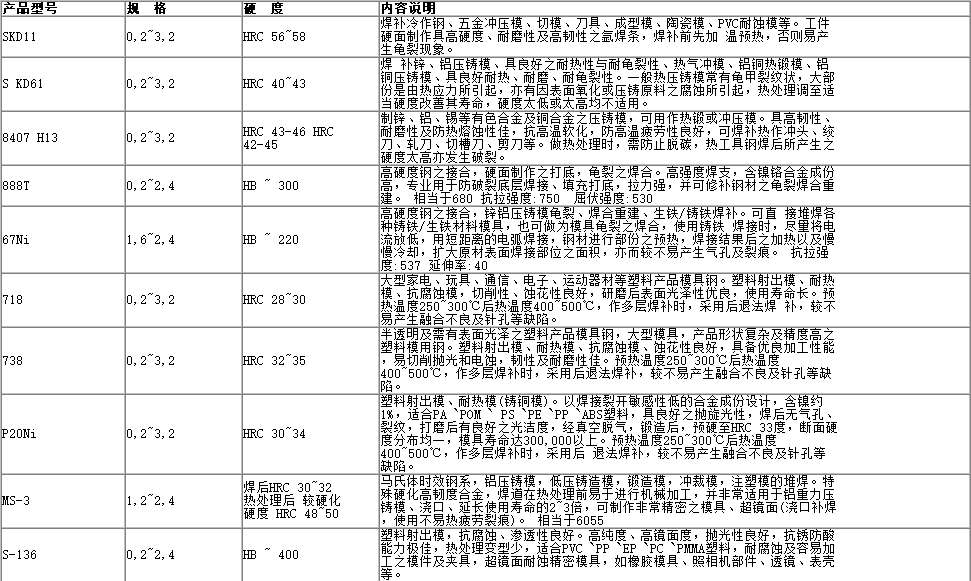 模具焊絲分為激光焊絲,模具焊絲等,適合汽車大型模具專用硬面堆焊焊條,各類車廠汽車沖壓模具使用修補及各廠牌模具鋼、工具鋼、五金沖壓模、壓鑄模、鍛造模、塑料模、鞋模等維修焊補模具鋼焊材、激光模具鋼焊材。