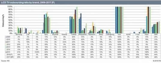 IHS Markit分析認為,2017年三星和飛利浦的電視生產(chǎn)外包策略主要在于獲取更多的面板資源。得益于此,全球電視生產(chǎn)業(yè)務外包比率在2017年預計將增加到46%。