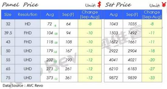 43”:8月價(jià)格下降10美金,9月預(yù)計(jì)降幅維持10美金。
