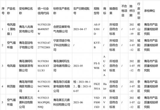 2021年電風扇產品質量市級監(jiān)督抽查結果匯總表