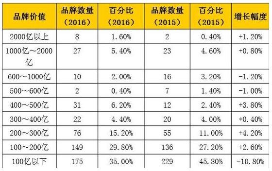 2016年《中國500最具價值品牌》價值范圍分布