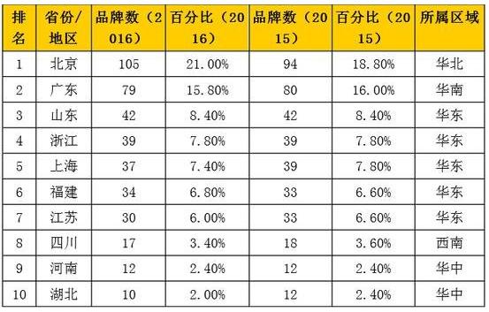 2016年《中國500最具價值品牌》區(qū)域分布(前10名省市)