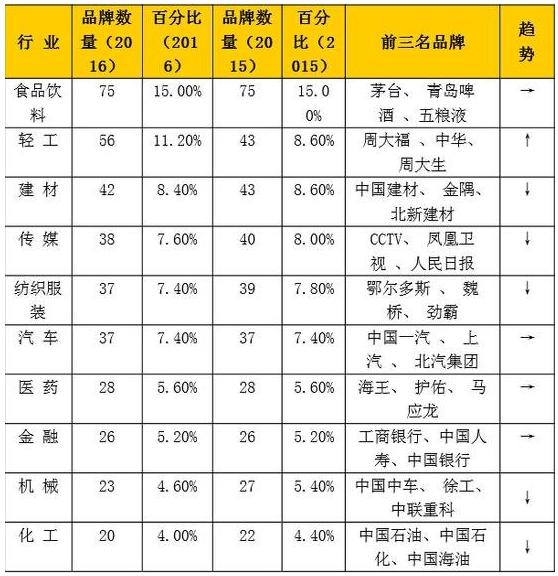 2016年《中國500最具價值品牌》行業(yè)分布(前10名行業(yè))