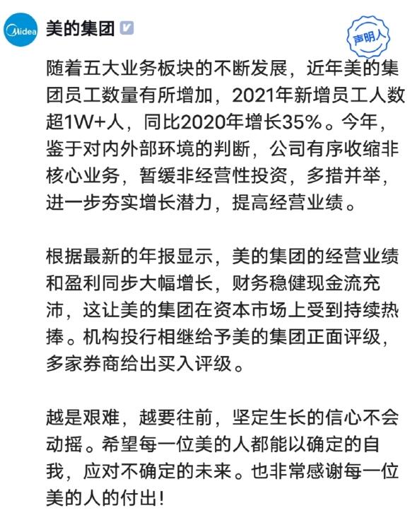 5月19日午間消息,近日,脈脈平臺上傳出美的裁員消息,今日,美的集團官方號回應(yīng)裁員消息稱!拌b于對內(nèi)外部環(huán)境的判斷,公司有序收縮非核心業(yè)務(wù),暫緩非經(jīng)營性投資,多措并舉,進一步夯實增長潛力,提高經(jīng)營業(yè)績。”