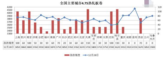 12月28日扁平材指數(shù)報121.68點,較上一交易日上漲1.00%。其中,熱軋板卷指數(shù)和中厚板指數(shù)分別上漲1.35%和上漲0.68%。今日熱卷期貨1705全天寬幅震蕩,現(xiàn)3405漲2.31%,放量增倉。4.75熱軋板卷市場價格大幅上漲。上海、南京、廣州、武漢、京津冀、沈陽、西安等20個城市價格上漲10—110元/噸,其中上海、南京、天津、沈陽、哈爾濱市場價格上漲超百元。據(jù)統(tǒng)計,全國24個市場4.75mm熱軋板卷價格報3804元/噸,較上一交易日價格上漲49元/噸。