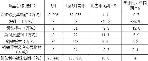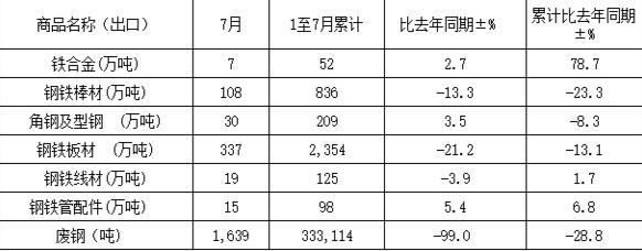 7月份出口廢鋼0.16萬(wàn)噸,同比下降99%;1-7月累計(jì)出口廢鋼33.3萬(wàn)噸,同比下降28.8%。