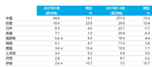2021年3月,中國(guó)粗鋼產(chǎn)量為9400萬(wàn)噸,同比提高19.1%;