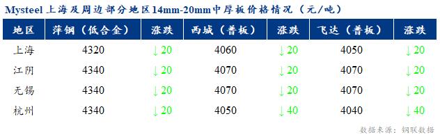 上周五上海中板現(xiàn)貨價格窄幅下行20-40元/噸。截止目前,上海普中板主流4080元/噸,低合金主流4320元/噸,C板主流4450元/噸,D板主流4490元/噸。