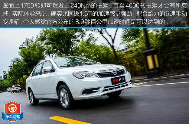 1.5T渦輪增壓發(fā)動機的運用是全新F3另一大亮點,從數(shù)據(jù)上看,1750轉(zhuǎn)就可以爆發(fā)240Nm的扭矩,它的車重為1.24噸,這些數(shù)字?jǐn)[在桌面上,應(yīng)該能使不少人心動。我也非常想對它的加速能力進(jìn)行測試,但試駕當(dāng)天一直在下雨,地面非常濕滑,所以這個計劃只能作罷。不過比亞迪官方給出的0-100km/h加速時間為8.9秒,還是很不錯的成績。