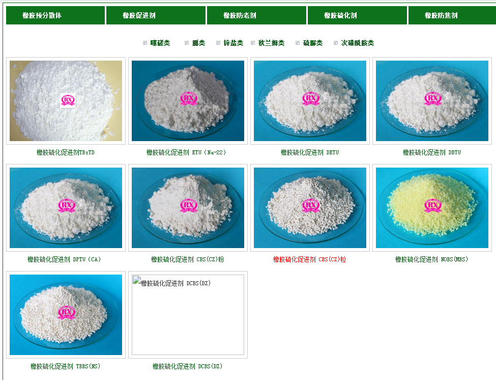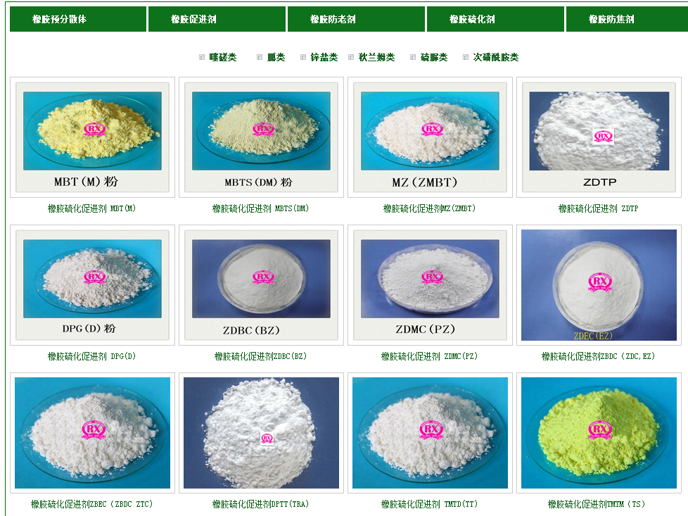 橡膠防老劑 rd(tmq),mb(mbi), 4010na(ippd), 4020(6ppd),2246, 3010(dtpd),mmb(mmbi), mmbz(zmmbi,zmti),mbz(zmbi), nbc(ndbc),防焦劑 pvi(ctp) 、防焦劑 e,綠色環(huán)保助劑 tibtd(ibtd), sdbc-40(tp), tbztd,tibtm等,有粉 狀、顆粒狀、油狀顆粒、預(yù)分散顆粒mbt-75、mbts-80、dpg-75、dptt-80等不同方法,并且還可以為客戶提供橡膠添加劑 產(chǎn)品解決方案。