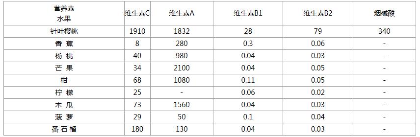 (1)本表中針葉櫻桃的維生素 c成分是以熟紅果檢測(cè)而得,如以七分熟果檢測(cè),維生素 c含量更高。