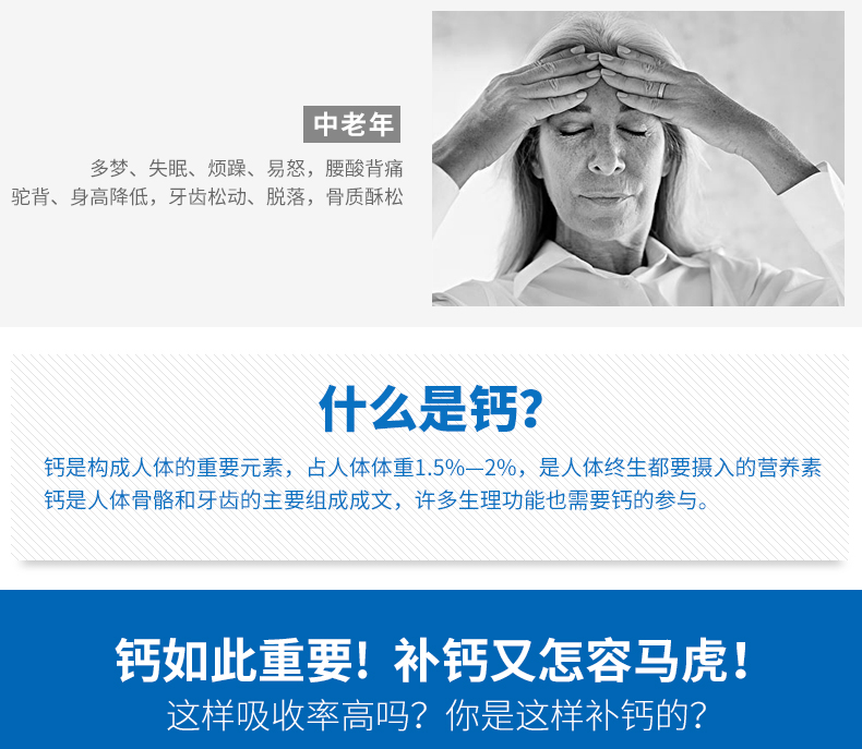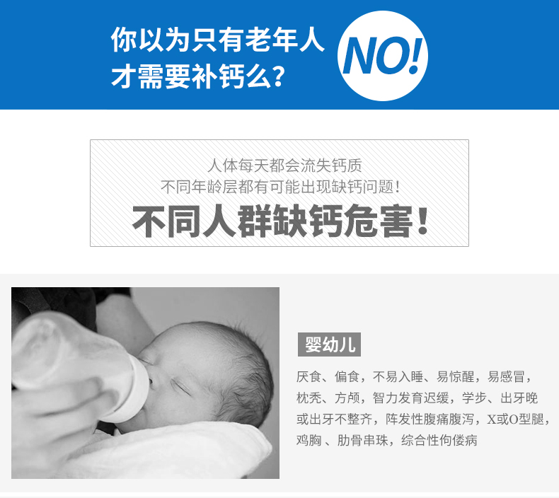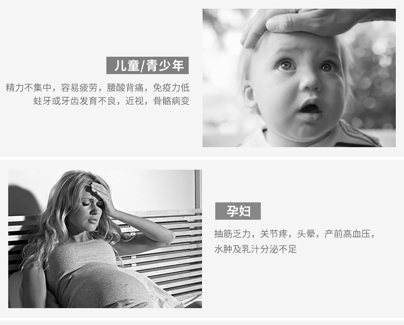嬰兒、兒童少年、中老年人、孕婦等群體缺鈣、失眠、骨質(zhì)疏松等癥狀。