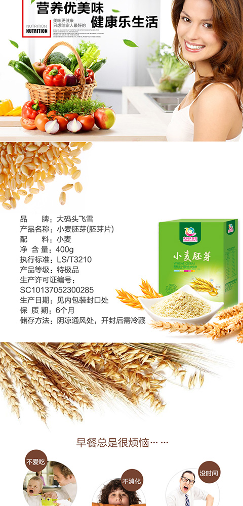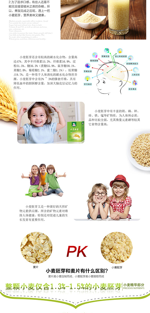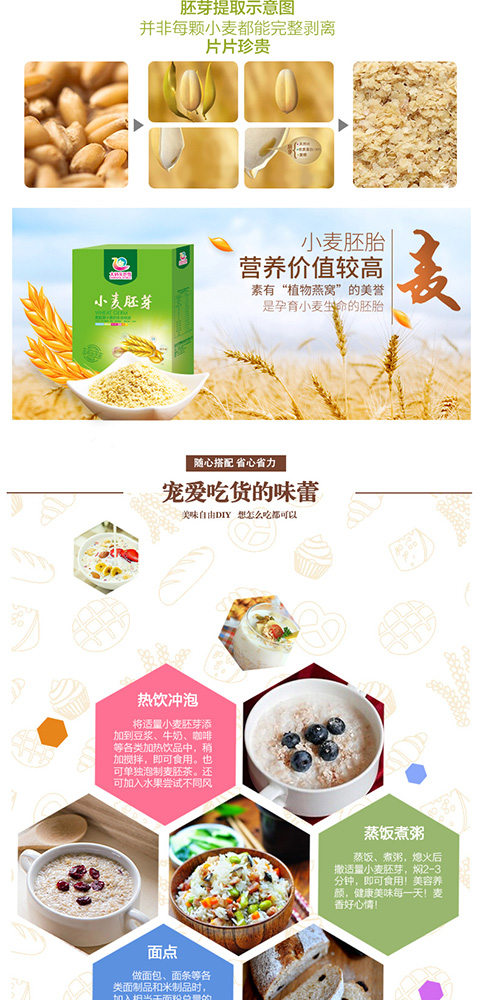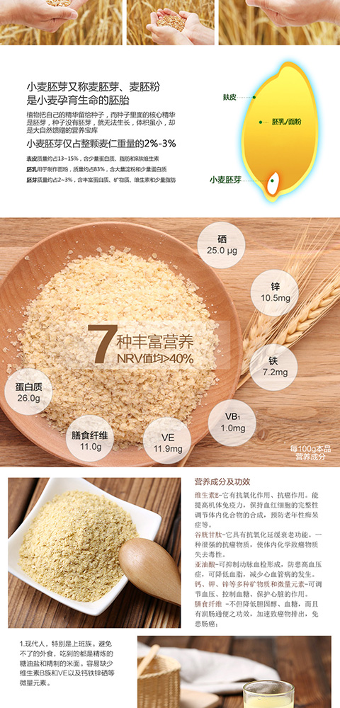 小麥 胚芽中含有人體必需的8種氨基酸 ,是提高機(jī)體免疫力、提高抗病能力的最基本物質(zhì);含有豐富的維生素 ,特別是天然維生素 e,有軟化血管、防治心腦血管病、延緩衰老等諸多功效;含有鈣、鉀 、鎂、鐵、鋅、鉻、硒、磷、錳、銅等多種礦物質(zhì)和微量元素 ,有調(diào)節(jié)血壓、控制血糖、保護(hù)心臟的作用;含有多不飽和脂肪酸 ,尤其是人體內(nèi)無法合成必需的亞油酸 含量極高,可降低血脂,避免和減少心血管病的發(fā)生;所含的谷胱甘肽,是一種很強(qiáng)的抗癌物質(zhì),使體內(nèi)化學(xué)致癌物質(zhì)失去毒性。小麥 胚芽沖泡后的麥 胚寶呈誘人的奶黃色,是胚芽自身的黃酮 素 ,對心血管方面的疾病均有很好的治療作用;它含有大量的膳食纖維,不但降低膽固醇、降低血糖,而且有潤腸通便之功效,加速致癌物的排出 ,免患腸癌;麥 胚還含有卵磷脂、胡蘿卜素 、核酸 、葉酸 等50多種天然營養(yǎng)成分!