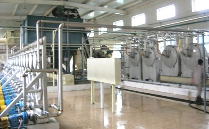 本工藝采用2臺串聯(lián)xs-1200型鼠籠式清洗機就行連續(xù)清洗。洗滌時,槽體中預(yù)先裝滿洗滌用水,由上道工序除石機出來的物料自流到洗薯機,從轉(zhuǎn)鼓的一端進料,薯塊在轉(zhuǎn)鼓中不斷地互相碰撞、摩擦、逐漸洗凈。同時在轉(zhuǎn)鼓內(nèi)側(cè)裝有螺旋使物料徐徐前進,經(jīng)過幾分鐘到達轉(zhuǎn)鼓的另一端,陸續(xù)被轉(zhuǎn)鼓撈斗撈出水面,洗下的泥沙污物聚集于漏斗之中上,每隔1小時開一次排污閥排放泥沙污物。