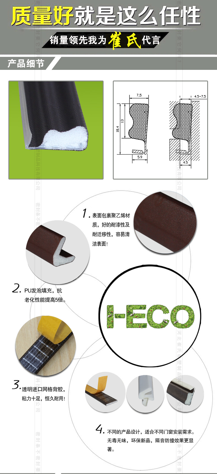 隔熱防寒,防風(fēng)塵及爬蟲,外觀高檔,耐老化 防紫外線 防水不變形 產(chǎn)品質(zhì)保10年 深得國內(nèi)高端門窗廠家認(rèn)可,是目前國內(nèi)最高端的新一代門窗密封條產(chǎn)品