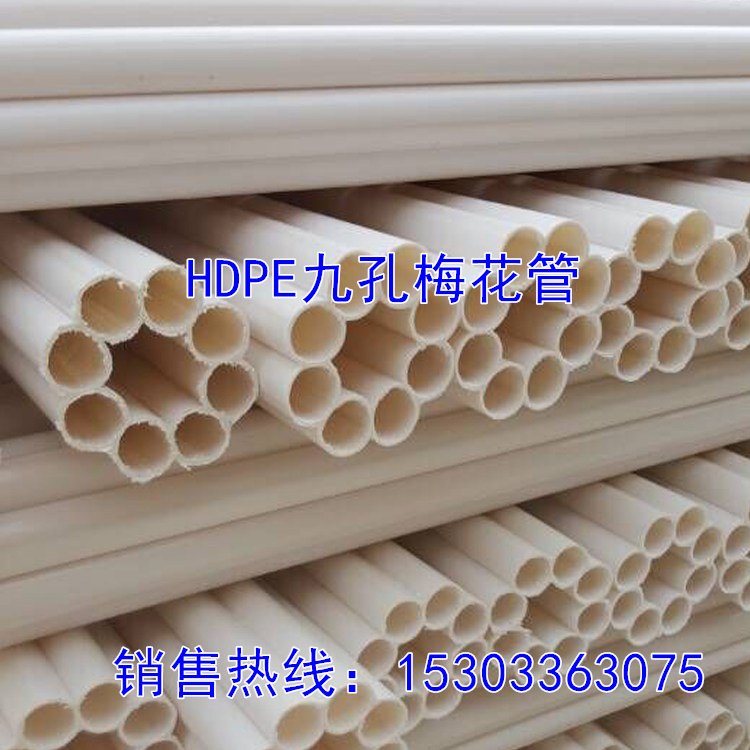 七孔梅花管和五孔梅花管是一次性成型的一體化多孔護(hù)套管,施工方便,增加了預(yù)埋孔數(shù),提高了施工速度,大大降低了工程單位的材料及施工成本。梅花管是90年代末的新型管材,主要特點是方便經(jīng)濟,免除二次傳子管,整體工程造價低,并減少管群所占用的人孔及管溝的位置破路面積,是城市通訊管道發(fā)展的前景和必然趨勢。安 裝九孔、七孔、五孔梅花管每6米配接頭一個,接頭內(nèi)有定位槽,安 裝時將管頭與接頭連接緊密,用木板夯實即可。