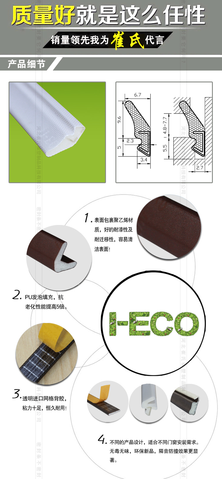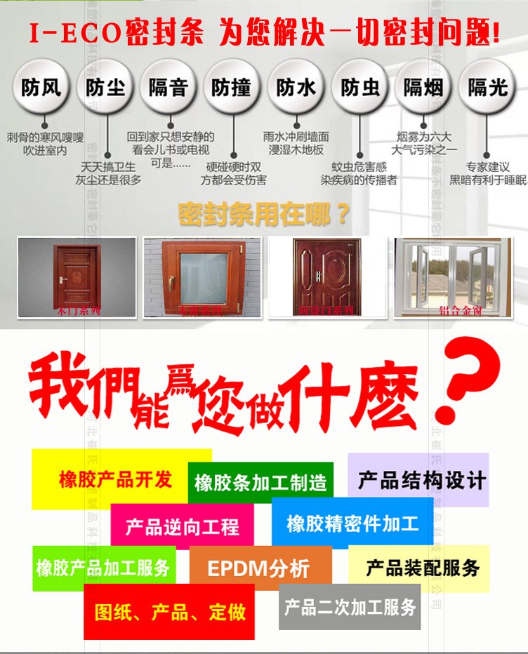隔熱防寒,防風(fēng)塵及爬蟲,外觀高檔,耐老化 防紫外線 防水不變形 產(chǎn)品質(zhì)保10年 深得國內(nèi)高端門窗廠家認(rèn)可,是目前國內(nèi)最高端的新一代門窗密封條產(chǎn)品