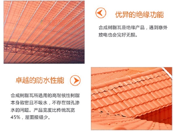 合成樹脂瓦是運用高新化學化工技術研制而成的新型建筑材料,具有重量輕、強度大、防水防潮、防腐阻燃、隔音隔熱等多種優(yōu)良特性,普遍適用于開發(fā)區(qū)平改坡、農貿市場、商場、住宅小區(qū)、新農村建設、高檔別墅、雨篷、遮陽篷、仿古建筑等。