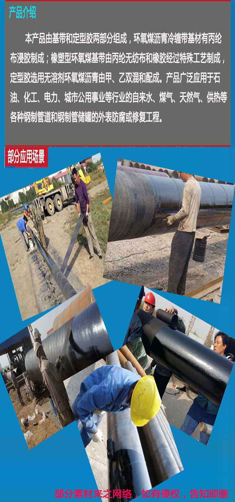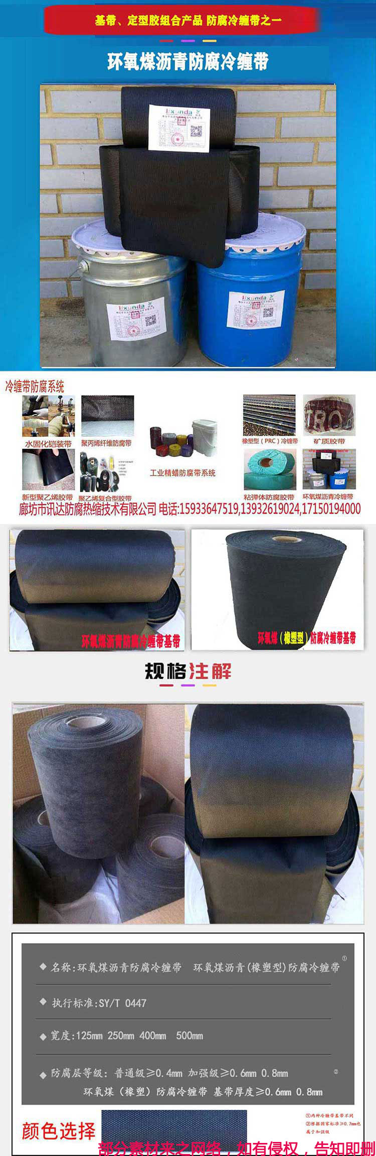 環(huán)氧煤瀝青冷纏帶基帶和定型膠兩部分組成。環(huán)氧煤瀝青冷纏帶基帶選用增強(qiáng)合成纖維——丙綸無紡布,浸漬環(huán)氧煤瀝青基材膠經(jīng)脫油制成;(rpc)環(huán)氧煤橡塑型防腐冷纏帶基帶由丙綸無紡布和橡塑材料經(jīng)過特殊工藝制成;定型膠選用無溶劑 環(huán)氧煤瀝青由甲 、乙雙混和配成。產(chǎn)品廣泛應(yīng)用于石油、化工、電力、城市公用事業(yè)等行業(yè)的自來水、煤氣、天然氣、供熱等各種鋼制管道和鋼制管儲(chǔ)罐的外表防腐或修復(fù)工程。