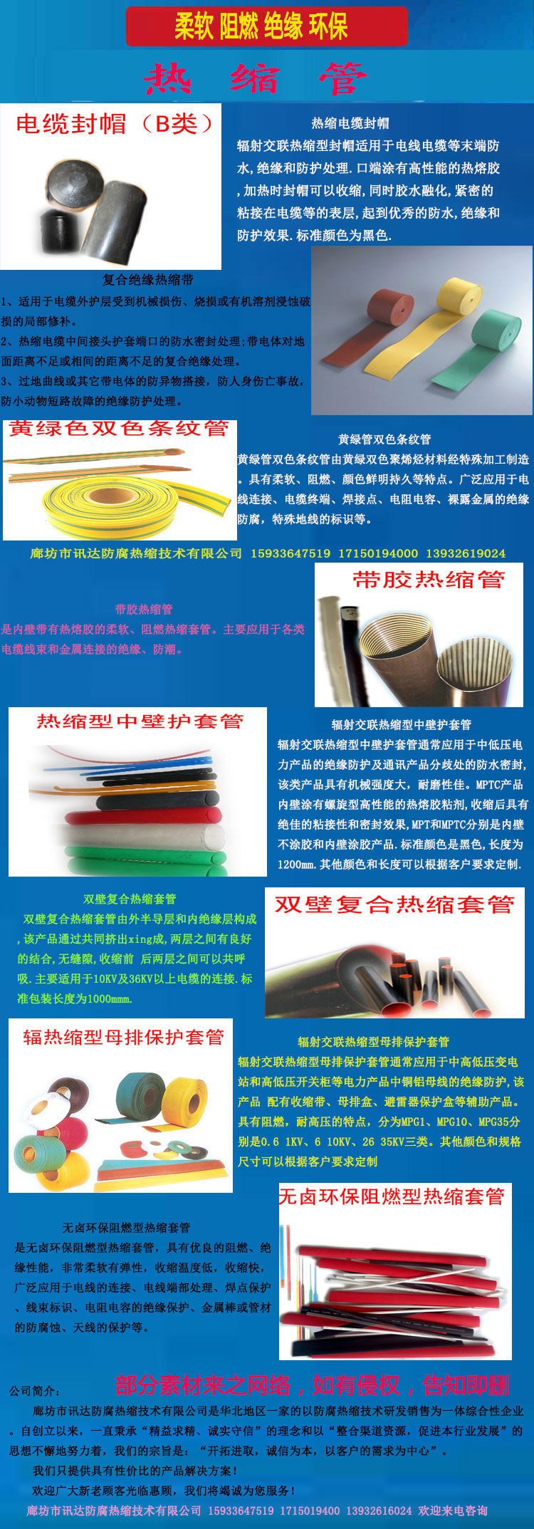 另供應(yīng)黃綠管雙色條紋管、帶膠熱縮管、無(wú)鹵環(huán)保熱縮管、中壁護(hù)套管、雙壁護(hù)套管、母排保護(hù)管,價(jià)格公道,質(zhì)量合用,歡迎選購(gòu)。