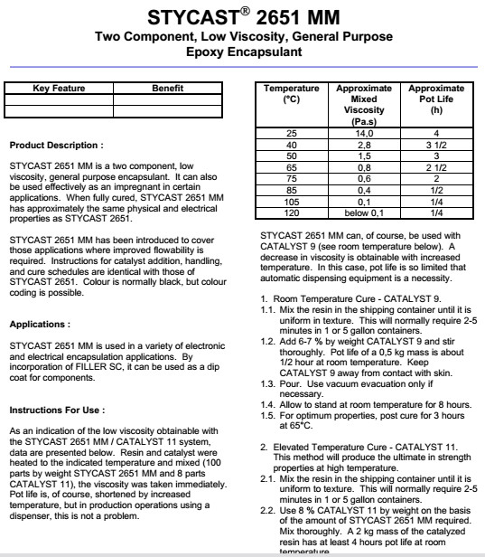黏 度:10 pas剪切強度: mpa工作時間:工作溫度:155 ℃保 質 期:12 個月固化條件:室溫/高溫主要應用:連接器/傳感器等電子包 裝:11磅/罐emerson&cuming stycast 2651-40是一種雙組份,易使用,低黏度環(huán)氧灌封/密封材料。對金屬、塑膠和陶瓷有很好的粘接力。可以常溫和升溫固化。該膠的標準顏色為黑色。但可以配成其它顏色。固化好的材料可以用碳鋼刀具進行加工。應用:stycast2651-40與catalyst11加熱固化后,它可以滿足mil-i-16923