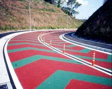 二、彩色道路防滑標(biāo)線是指通過采用高的性能的雙組分丙烯酸 樹脂,將混合選定的高抗磨值的防滑骨料鋪設(shè)于道路表面,使之與基材完好地結(jié)合在一起,在保障優(yōu)良的附著力、高抗磨強(qiáng)度的前提下,減少因道路表面光滑而造成的事故,并縮短剎車距離。