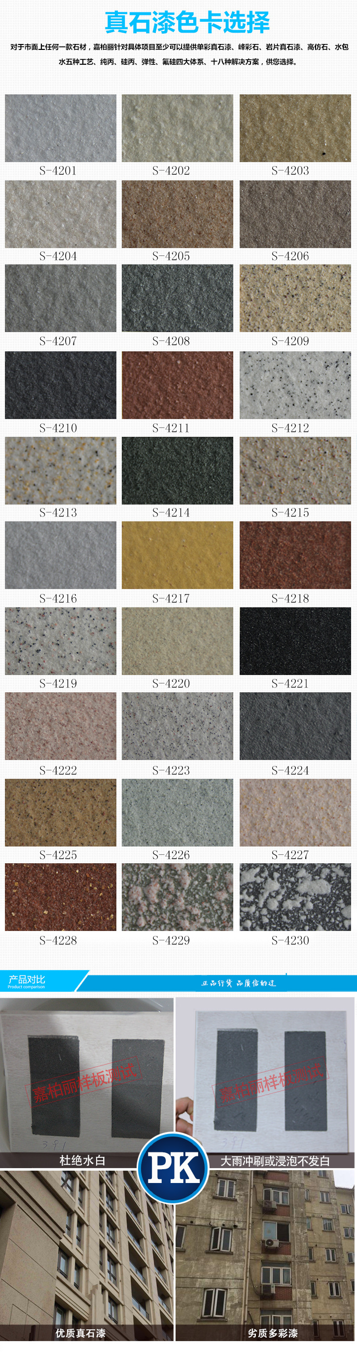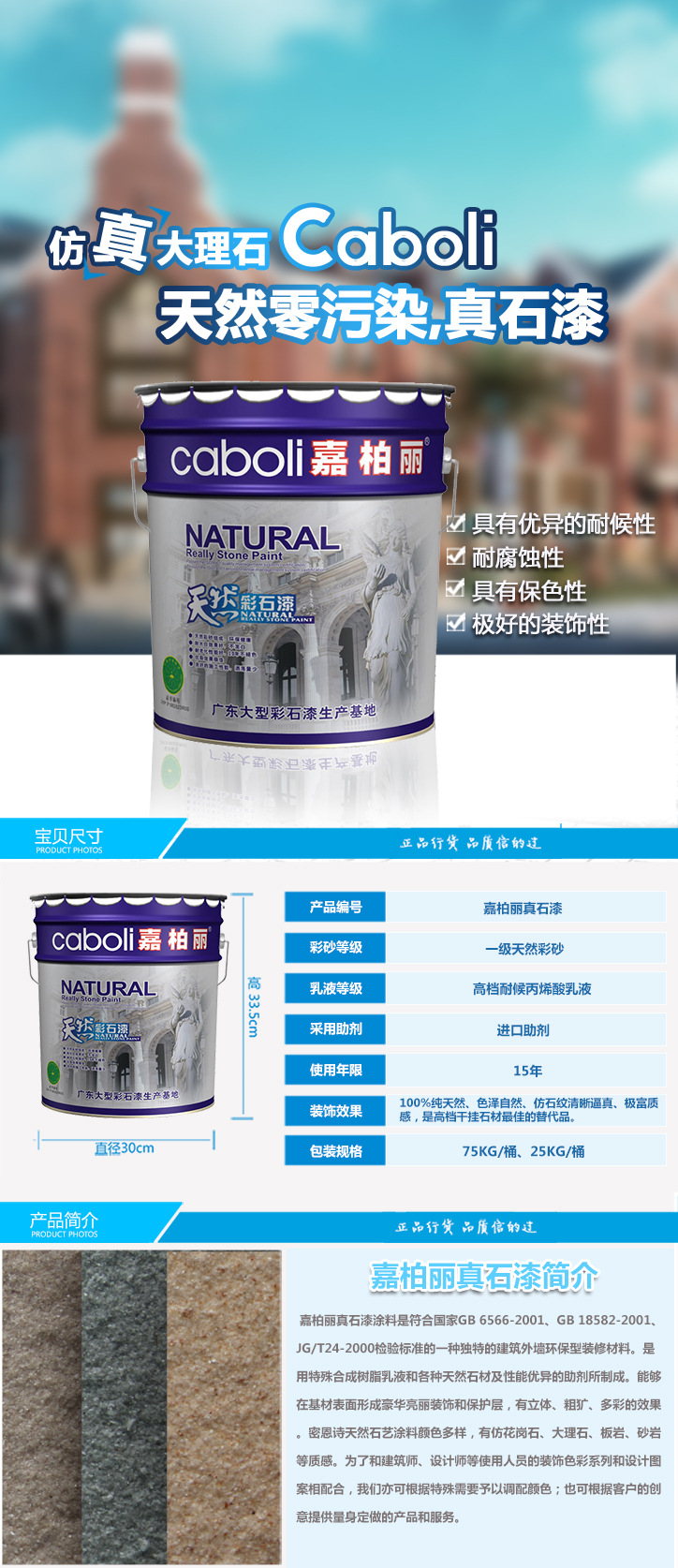 嘉柏麗涂料是一家有豐富研究真石漆涂料經(jīng)驗(yàn)的涂料企業(yè)。真石漆主要采用各種顏色的天然石粉 配制而成,應(yīng)用于建筑外墻的仿石材效果,因此又稱液態(tài)石。真石漆裝修后的建筑物,具有天然真實(shí)的自然色澤,給人以高雅、和諧、莊重之美感,適合于各類建筑物的室內(nèi)外裝修。特別是在曲面建筑物上裝飾,生動(dòng)逼真,有一種回歸自然的效果。真石漆具有防火、防水、耐酸 堿 、耐污染。無毒、無味、粘接力強(qiáng),永不褪色等特點(diǎn),能有效地阻止外界惡劣環(huán)境對(duì)建筑物侵蝕,延長建筑物的壽命,由于真石漆具備良好的附著力和耐凍融性能,因此適合在寒冷地區(qū)使用。