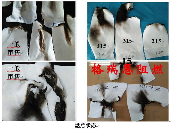 *格瑞恩團(tuán)隊(duì)研發(fā)的zbs-215/ zbs-315體系處理后的織物觸火可燃,燃燒火勢小,伴有少量白煙,不會出現(xiàn)熔滴現(xiàn)象,且離火立即自熄或3s內(nèi)自熄。而通阻燃劑 處理后的織物觸火時易燃,燃燒火勢大,伴有濃濃黑煙或熔滴,且離火不能自熄。