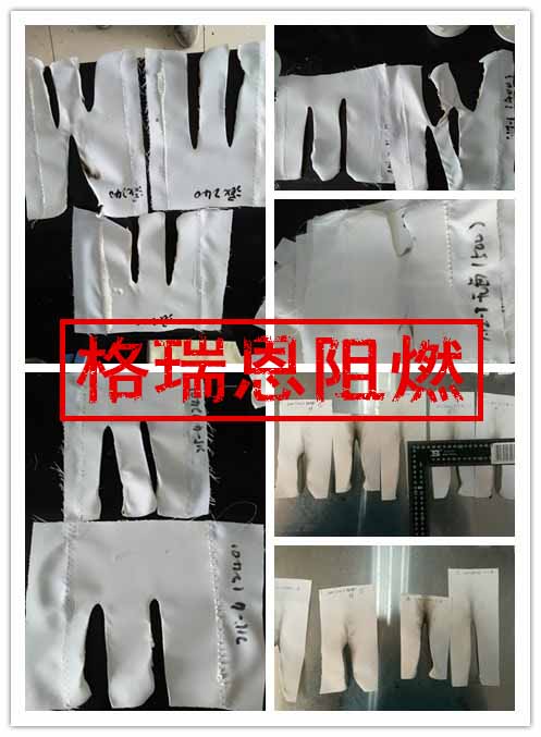 2、zbs-500阻燃劑 體系處理后的織物兩端拉緊觸火時(shí),不易發(fā)生明火,兩側(cè)可陰燃至寬度為1-2cm,向上陰燃至6cm左右。而普通阻燃劑 處理后的織物兩端拉緊觸火時(shí)易燃,可見明火且火勢(shì)大;