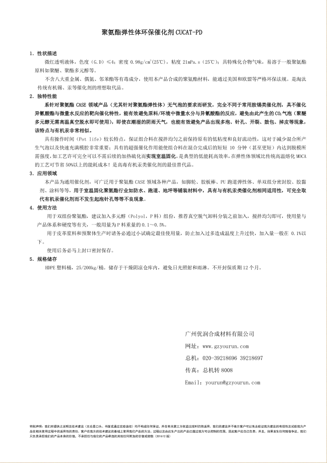 廣州優(yōu)潤合成材料有限公司是一家致力于聚氨酯(聚氨酯塑膠跑道、聚氨酯涂料、膠黏劑、密封膠、彈性體)領域所需的各類特種添加劑(尤其是聚氨酯彈性體不發(fā)泡催化劑)及特殊應用的聚氨酯彈性體的開發(fā)與應用的科研生產型企業(yè),公司主要人員由在聚氨酯研究領域工作多年的化工專家和一線技術應用工程師構成,依靠自身專業(yè)聚氨酯領域的技術優(yōu)勢和豐富經驗,為各類聚氨酯彈性體、密封膠、膠黏劑、涂料等的生產企業(yè)提供技術輔導和差異化的...