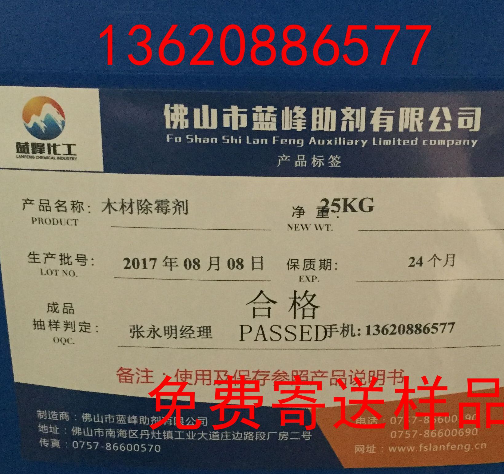 我佛 山市藍峰助劑 有限公司生產的木材除霉劑 產品是新一代高活性除霉、去霉?jié)饪s液,產品主要成分為霉菌分解因子、殺菌抑菌劑 ,可去除多種細菌、真菌、蛀蟲、及霉菌孢子引起的產品霉變,是目前市場上最有效、最快捷、最實惠的新型除霉產品。執(zhí)行標準 國家標準gb18582-2001