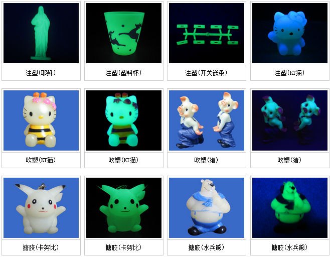 航彩夜光粉 顏色:短效夜光粉 有一種顏色,綠光。長效夜光粉 有6個顏色,綠光、蘭光、紫光、紅光、橙紅、白色。