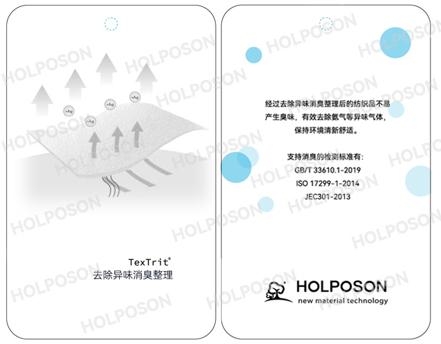 HOLPOSON® Hulk 是我司東華大學(xué)博士團(tuán)隊(duì)開發(fā)的紡織品消臭整理劑 ,能夠有效吸附氨、硫化氫、甲 基硫醇以及苯 酚,氧化氮、醛 類等有刺激氣味的臭氣,具有良好的凈化異味氣體功能,為適用人群營造舒適清新安 全的生活環(huán)境。消臭整理劑 HOLPOSON® Hulk可以在滌綸,棉,粘膠及混紡織物后整理工藝添加,適用于:家紡、服裝、地毯、窗簾、襪子、車內(nèi)飾等領(lǐng)域。